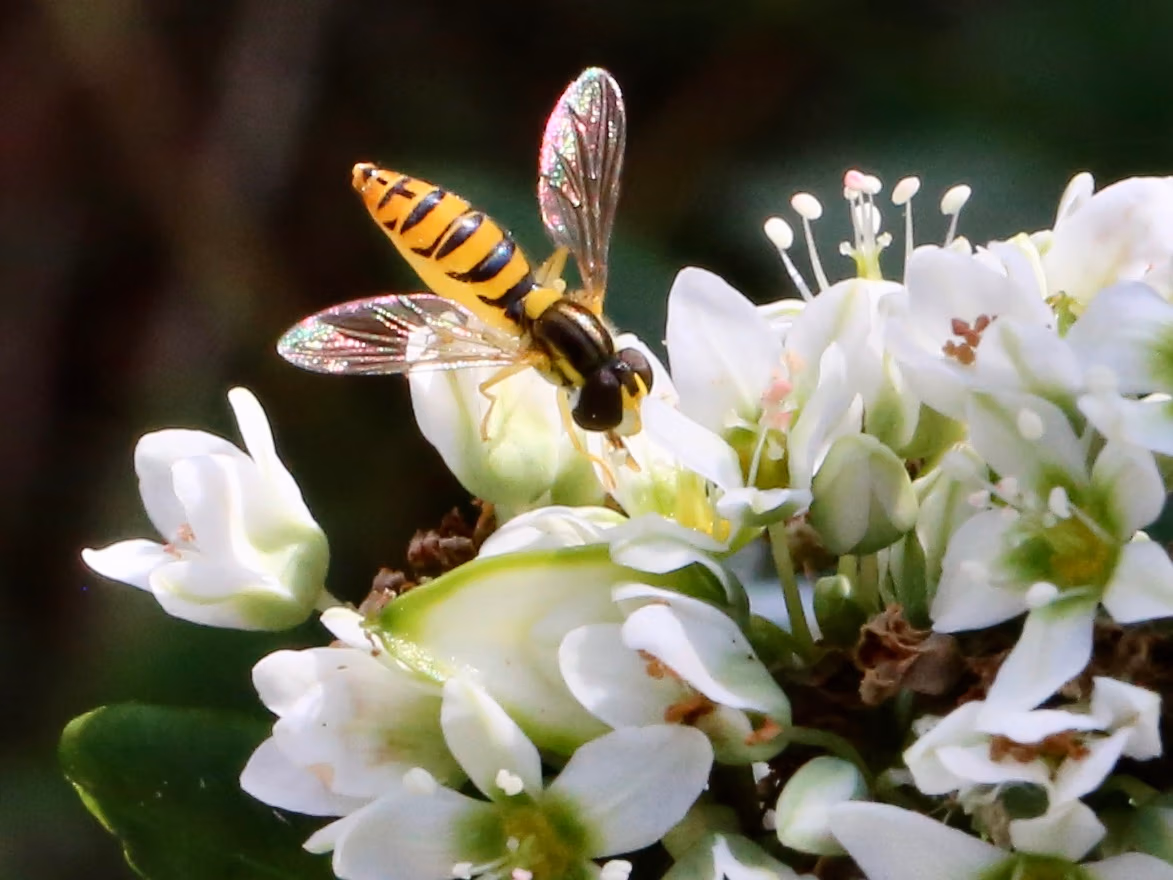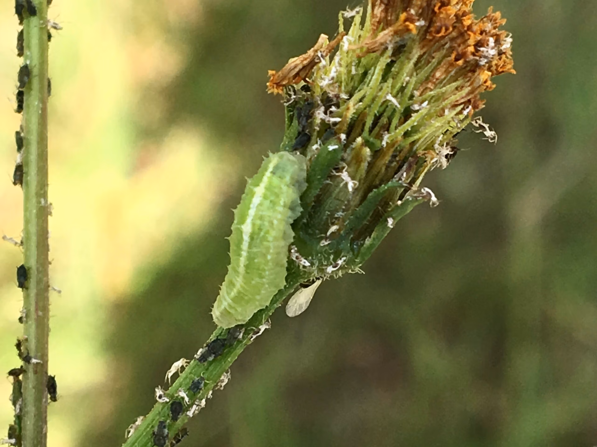 Hover flies are a wonderful insect to have in your crop because the adults commonly act as pollinators (and look very much like small bees, without the sting), whilst the larvae commonly feed on aphids, scale, thrips and caterpillars. The larvae are flattened, legless and maggot-like, mostly green or brown in colour, however they are often mistaken for pest caterpillars. They can be easily distinguished from caterpillars because they lack a defined head capsule.