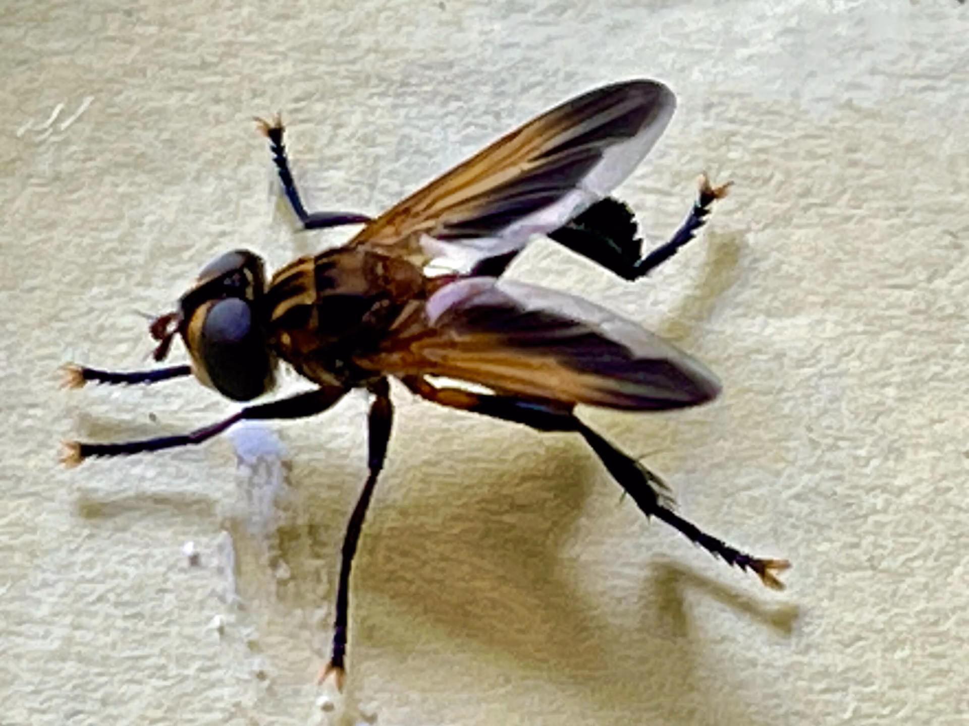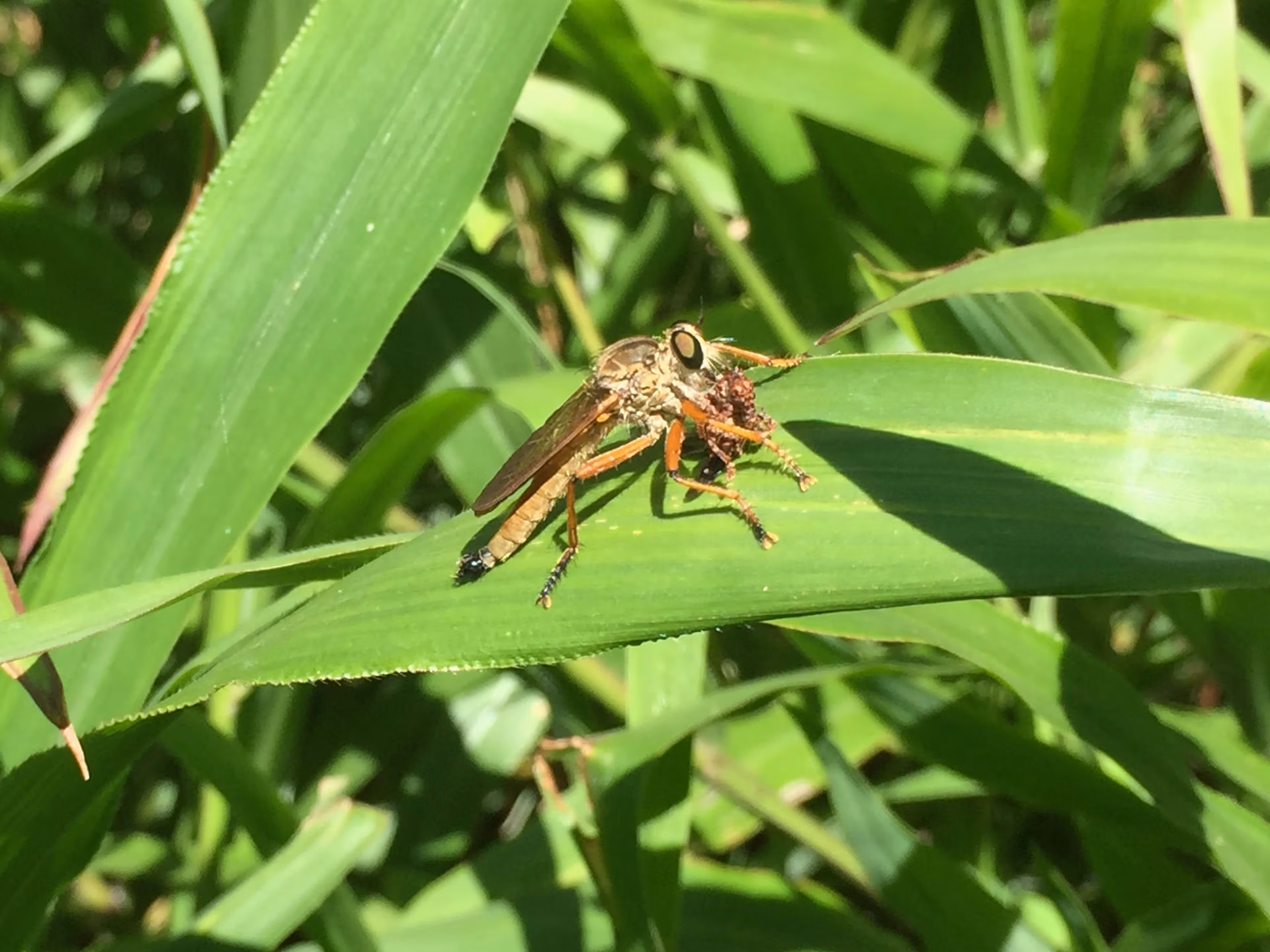 It may be surprising to find out that some flies are predatory! Robber flies are opportunistic predators, with most of their diet comprising of other flies, beetles, wasps, bees, true bugs and moths/caterpillars. Robber flies seize their prey in flight and inject their victims with saliva containing neurotoxic enzymes. There are many species of robber flies with a range range in size, but on average they are between 9 and 15 mm in length.