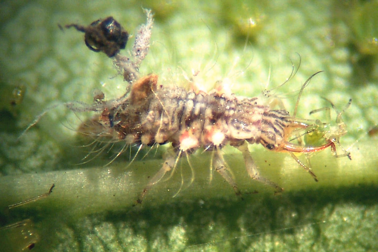 Green lacewings (Chrysopidae) and brown lacewings (Hemerobiidae) are highly beneficial within agricultural crops because they feed on a wide variety of plant pests such as lace bug, thrips, aphids, scale, mites, mealybugs, moth eggs and caterpillars. Lacewings persist in cool temperatures, thereby lowering pest populations during winter and reducing the lag in biological pest control during early spring.